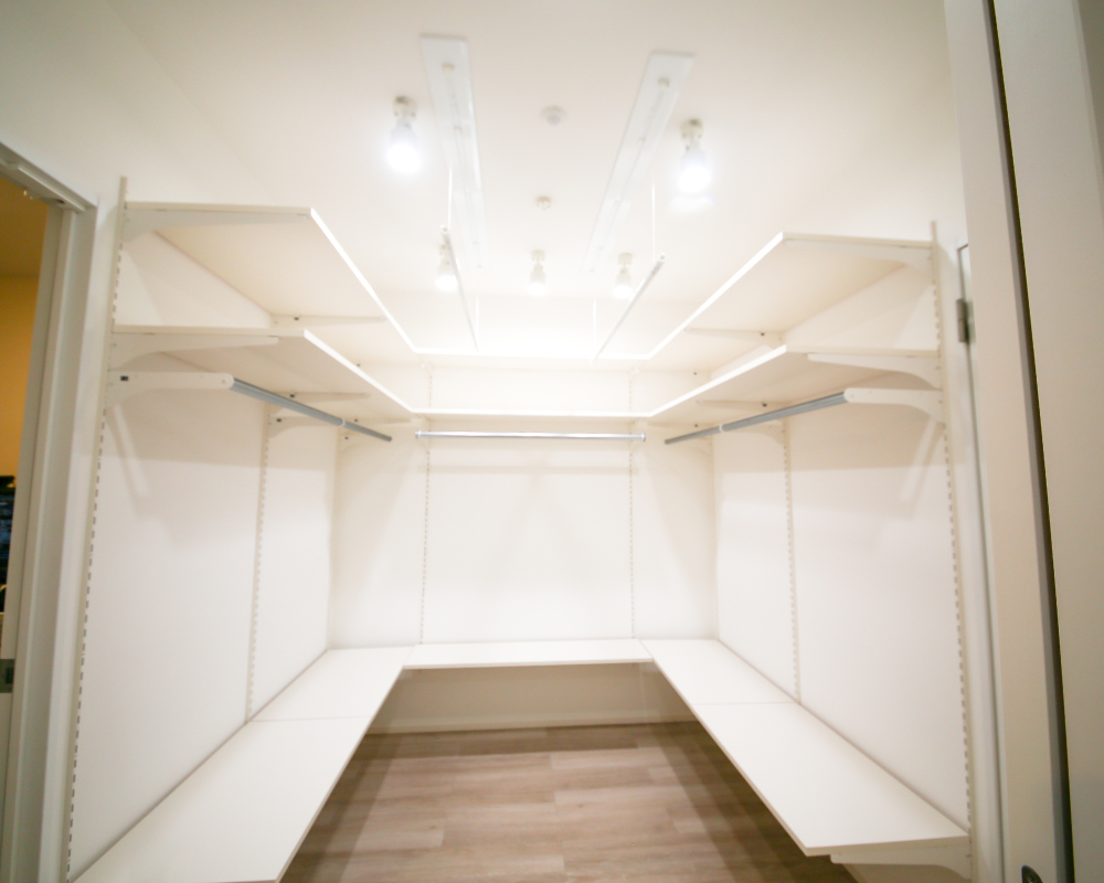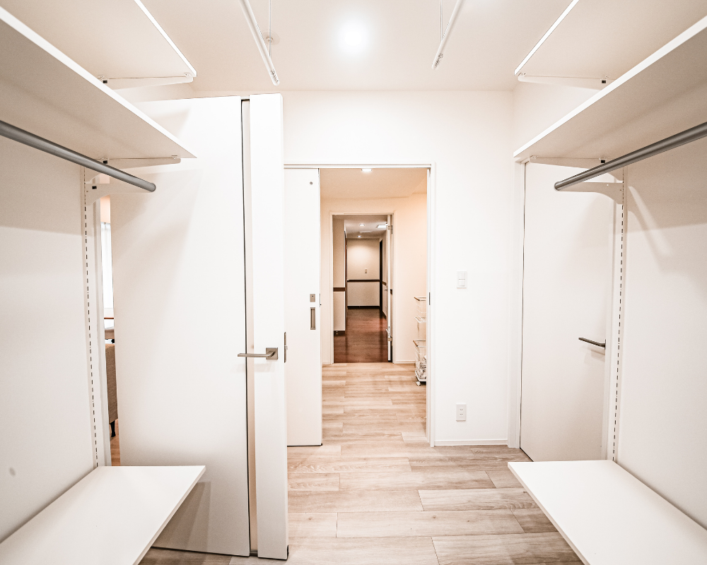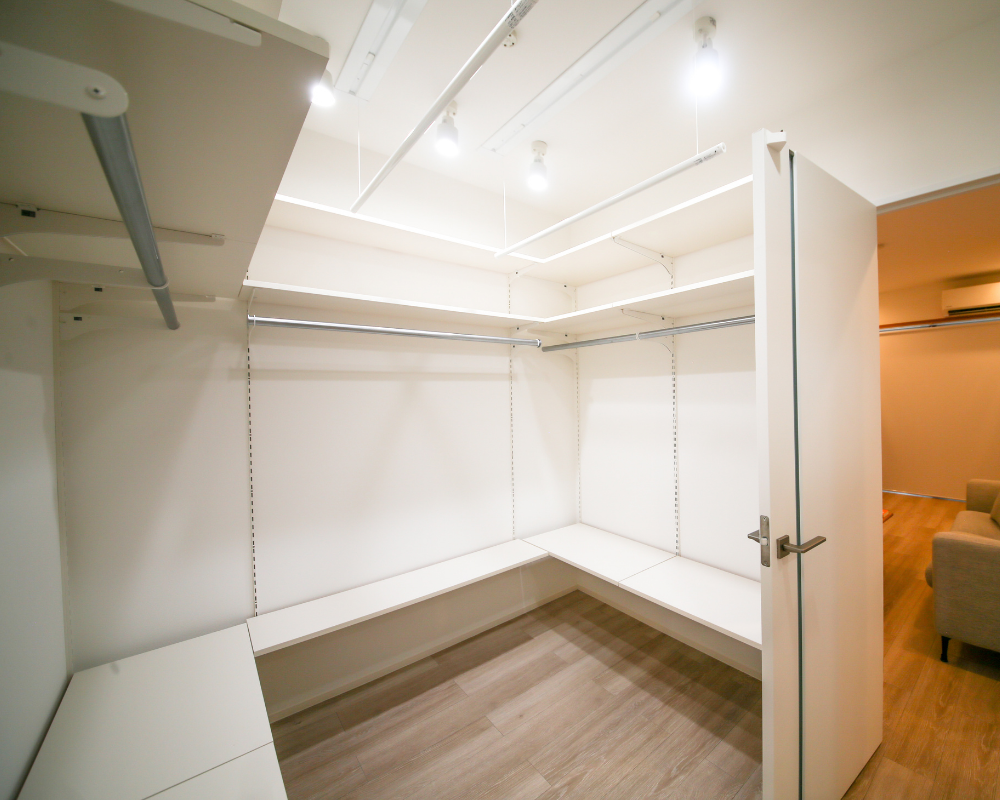 3つの空間をつなぐ形でウォークインクローゼット(WIC)を新設しました。白を基調とした明るい内装で、照明も複数設置。どの方向からでも自然光と照明が届く、開放的な収納空間に仕上がりました。
