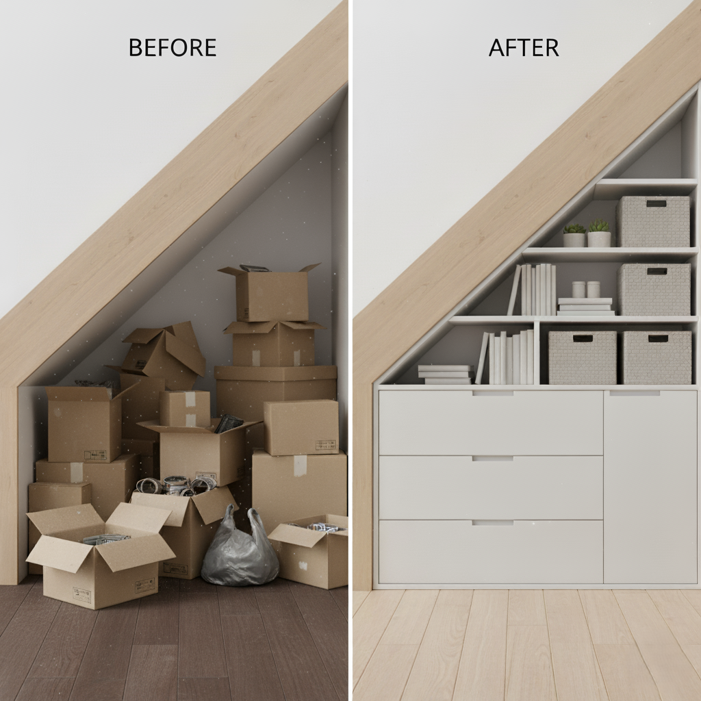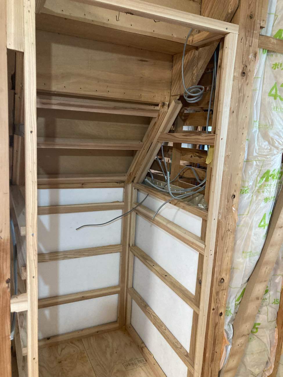 階段下の骨組みを活かしつつ、空間の奥行きをしっかり確保。掃除道具や日用品、小物などをすっきりしまえる“ミニ収納”が完成しました。見た目もスッキリしていて、生活の邪魔にならない“隠れた収納”として大変好評です。