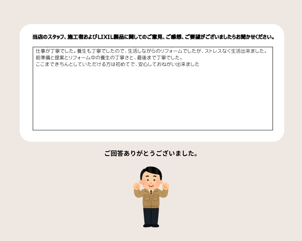 工事中の養生についてもお褒めいただき、スタッフ一同嬉しく思っております。お住まいや大切な家具を守るため、養生は特に丁寧に取り組んでいる工程のひとつですので、私たちにとって大きな励みになります。今後も安心してご相談いただけるようお客様へのアフターケアもしっかりおこなっていきますので引き続きどうぞよろしくお願い申し上げます。
