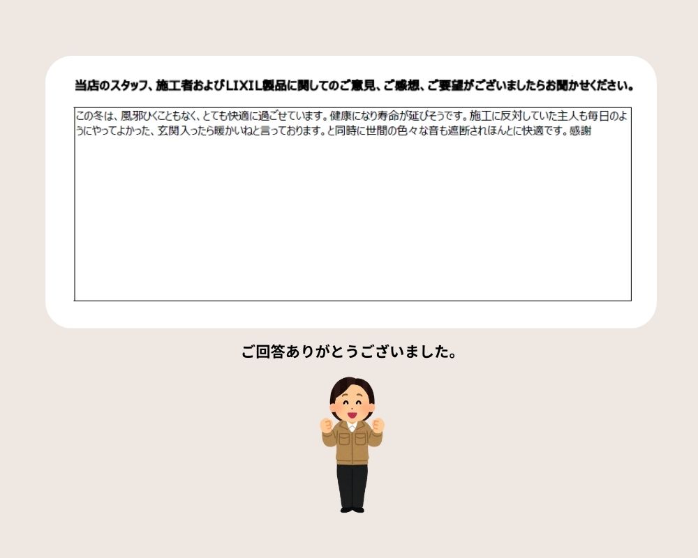 うにやってよかった、玄関入ったら暖かいねと言っております。と同時に世間の色々な音も遮断されほんとに快適です。感謝」