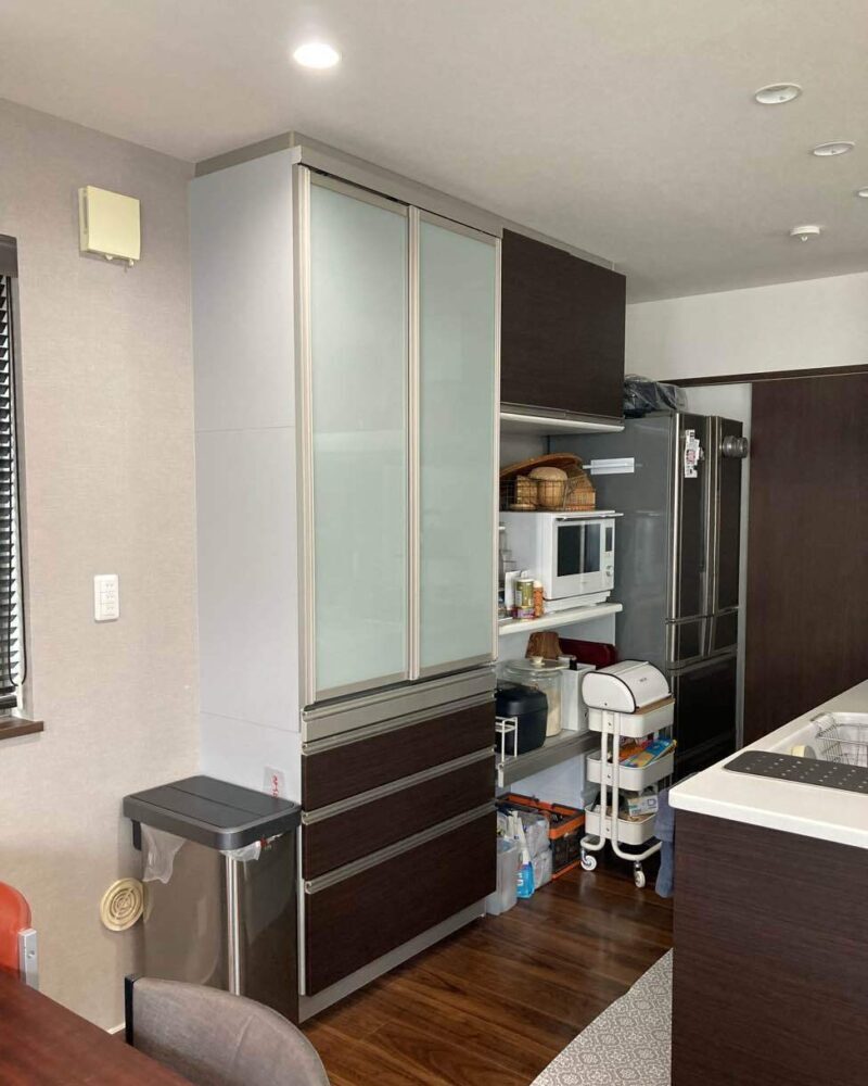 採用したのはLIXILの人気シリーズ「リシェル」。ハイグロス仕上げの扉とメタリックフレームのガラスパネルが、上質で洗練された印象を与えます。引き出し収納やリフトアップ式の扉で、調理家電や食器を効率的に整理できる機能性も魅力。見た目の美しさだけでなく、使いやすさを追求した収納プランで、毎日のキッチンワークが快適になりました。